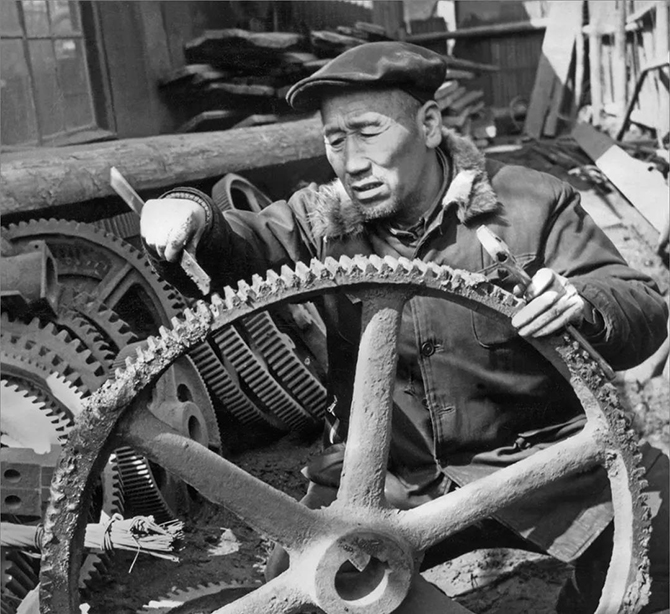 解放军进了鞍山,有人扛来了高粱米和白菜,请孟泰老伴帮他们做饭,这帮当兵的有的挑水,有的劈柴,有的烧火,饭菜做好后,又叫孟泰一家和他们一起吃。这是孟泰一家第一次吃高粱米干饭,真比吃山珍海味还香。 那天晚上,孟泰久久不能入睡,他对老伴说:“小日本、国民党都是穷人的冤家对头,共产党才是咱穷工人的大救星!” 过了些日子,忽然有人来找孟泰,说共产党一个姓寇的主任叫他到大白楼去一趟。寇主任见到孟泰又是握手,又是让座,又是倒茶水,孟泰激动得眼窝湿漉漉的。 寇主任笑呵呵地问他:“从前都干什么活?”“配管,维护高炉。” 孟泰说自己当过组长,手艺还挺好的,愿意动员其他工友早日恢复高炉生产。 寇主任高兴地拍了拍孟泰的肩膀说:“我们从别的工友那里了解了一些你的情况,你是党信任的同志,现在后方需要你这样的手艺人到那里搞生产,你带家里人一块儿去,有没有困难?” “没有困难!” 孟泰乐呵呵的,回答十分干脆,他知道只要跟共产党走,不愁没活干,不愁没饭吃。 他独自来到厂里,站在高炉的平台上,看着死气沉沉的整个厂区,他难过地流泪了。他真舍不得走啊,这里凝结着他和工友们的血和汗。可是他必须走,因为共产党需要他,他认准了这条路,跟着共产党走,棒打不回头。 为修复炼铁炉披星戴月 ![]()