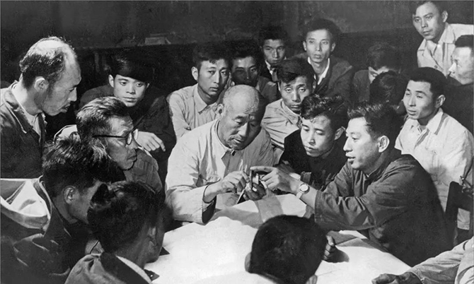 孟泰(前左三)与王崇伦(前右一)等经常在一起开展技术协作,解决生产难题。