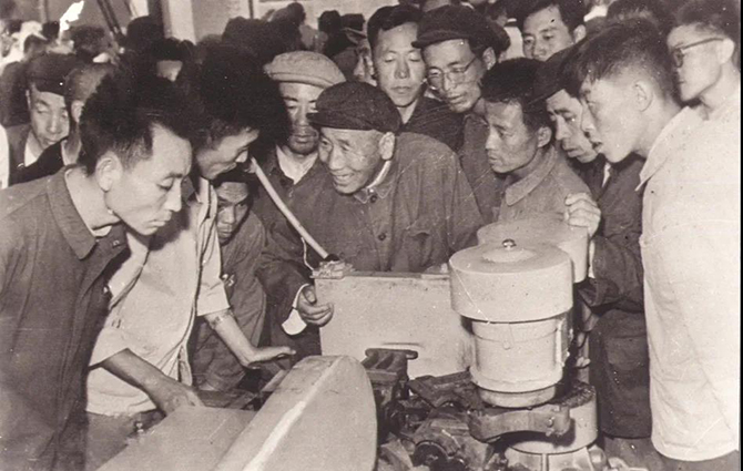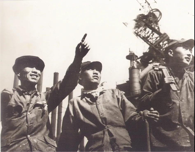 孟泰(左)和王崇伦(中)一起开展技术协作。