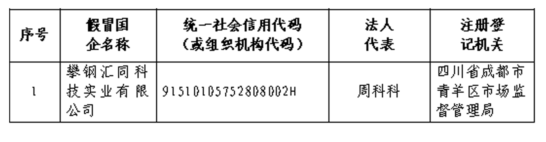 按照国务院国资委打击假冒国企专项行动工作部署,鞍钢集团有限公司(以下简称鞍钢集团)全面开展排查工作,并于2022年6月10日-2022年6月15日在鞍钢日报、鞍钢集团官网、摇篮鞍钢微信公众号等平台发布线索举报公告。经排查核实,攀钢汇同科技实业有限公司对外虚假宣传为鞍钢集团全资子公司攀钢集团有限公司的下属子公司,属于假冒国企行为。