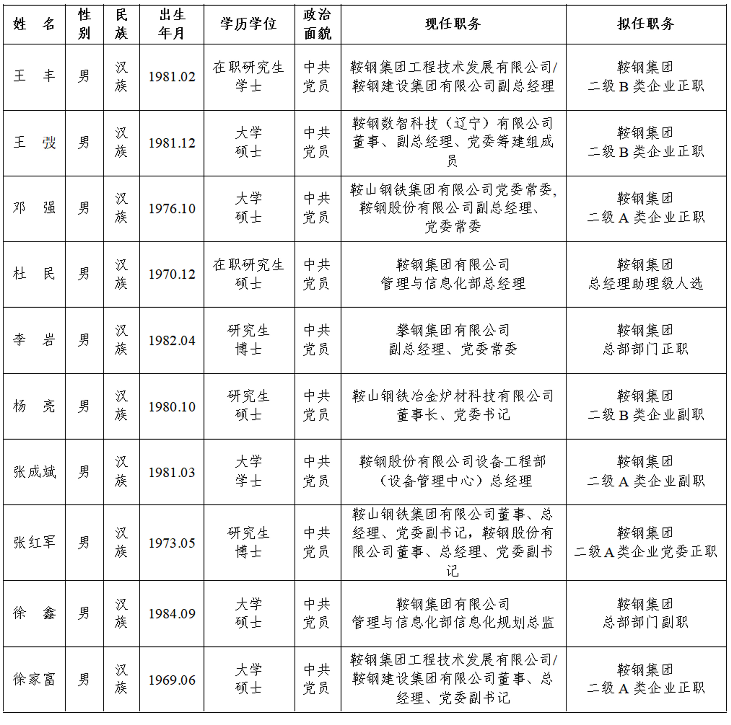经鞍钢集团有限公司党委研究决定,对10名拟任职领导人员面向全公司实施任前公示。公示期间,广大职工对拟任职领导人员在德、能、勤、绩、廉等方面的意见,可采取来信、来电、来访等方式向鞍钢集团党委组织部反映。公示时间:2025年8月14日至2025年8月20日。